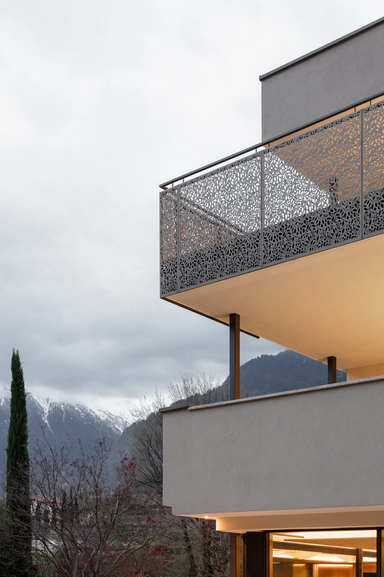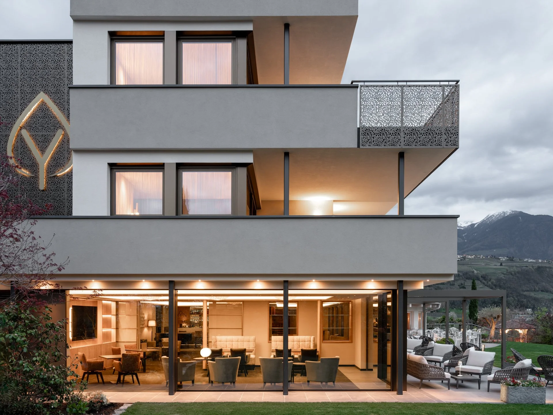 Die Architektur des Hotels zeichnet sich durch klare Linien, natürliche Materialien und eine offene Raumgestaltung aus, die den Gästen ein Gefühl von Wärme und Geborgenheit vermittelt. Große Fensterflächen sorgen für viel Tageslicht und ermöglichen einen atemberaubenden Blick auf die umliegende Natur. Das Design integriert lokale Elemente und Materialien, um die regionale Identität zu bewahren und gleichzeitig einen modernen Lebensstil zu reflektieren.