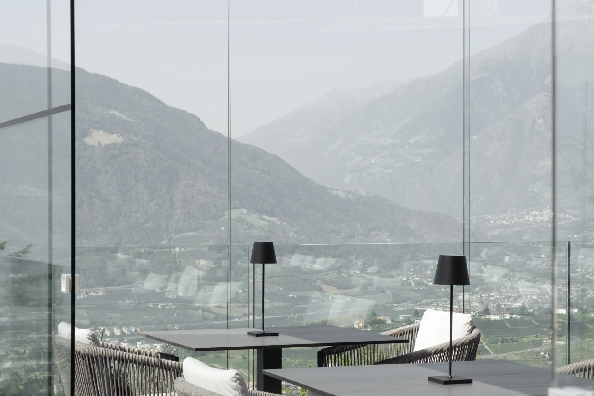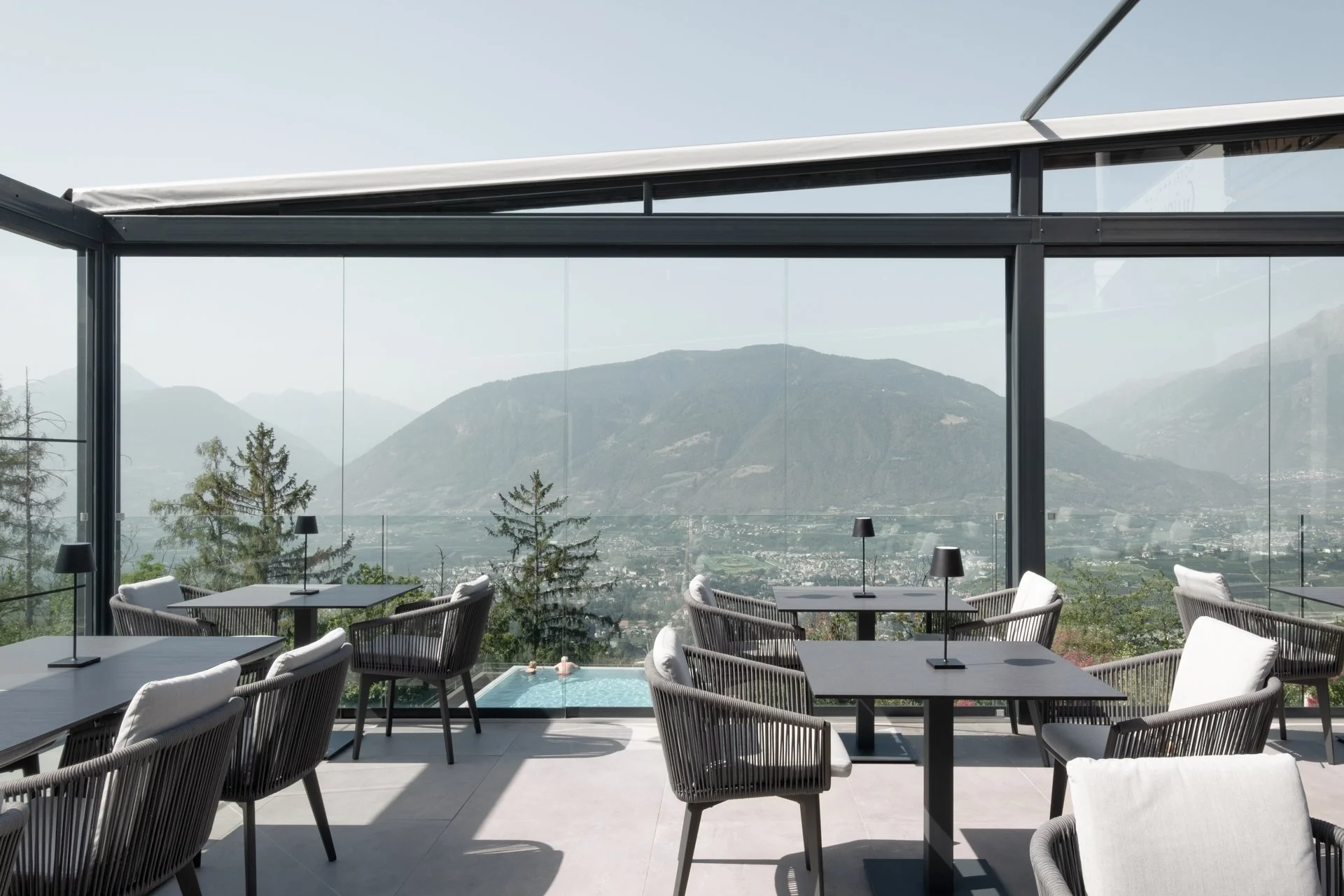 Die Neugestaltung und Erweiterung des Grünwalder Hofs in Schenna begann mit der Eingangshalle, der Bar und der Gastterrasse als erster Aufgabenstellung unseres Büros.